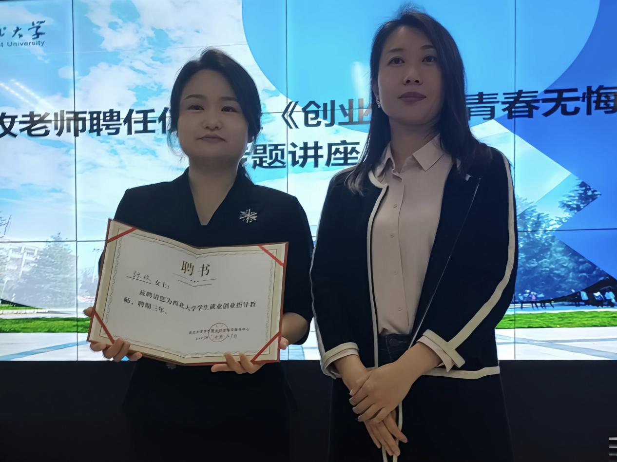 丁莹莹为张玫颁发亚博取款曝顾秒到账学生就业创业指导教师聘书,邵平为张玫赠送纪念品。